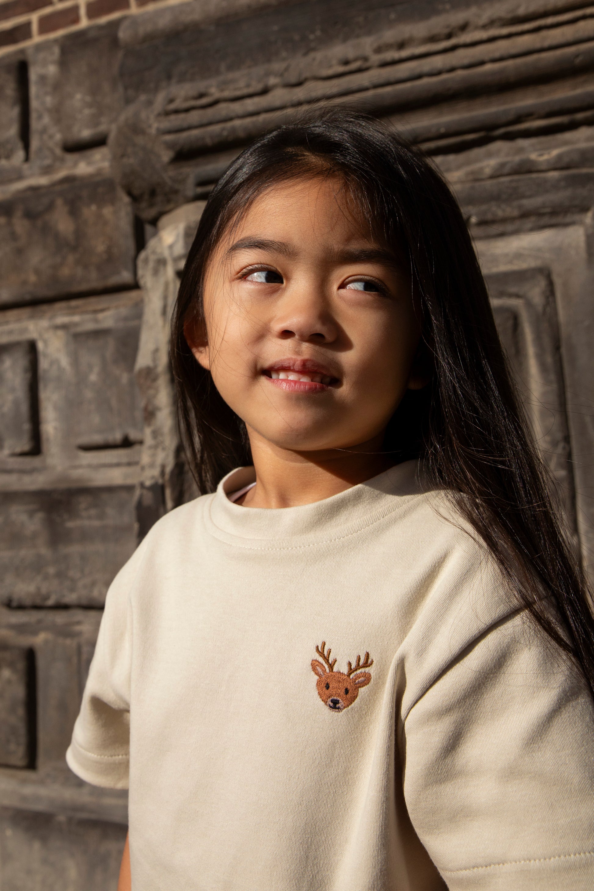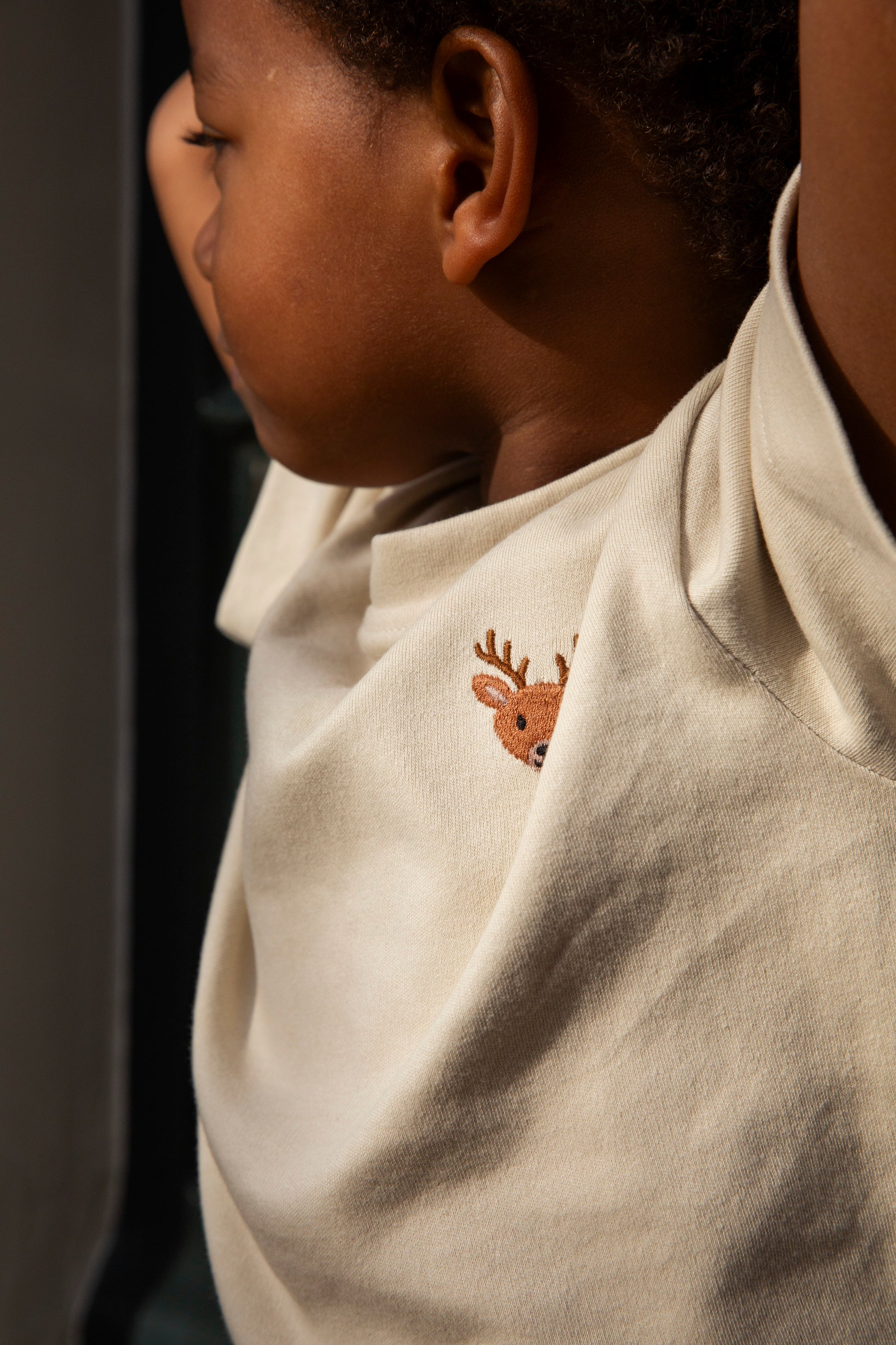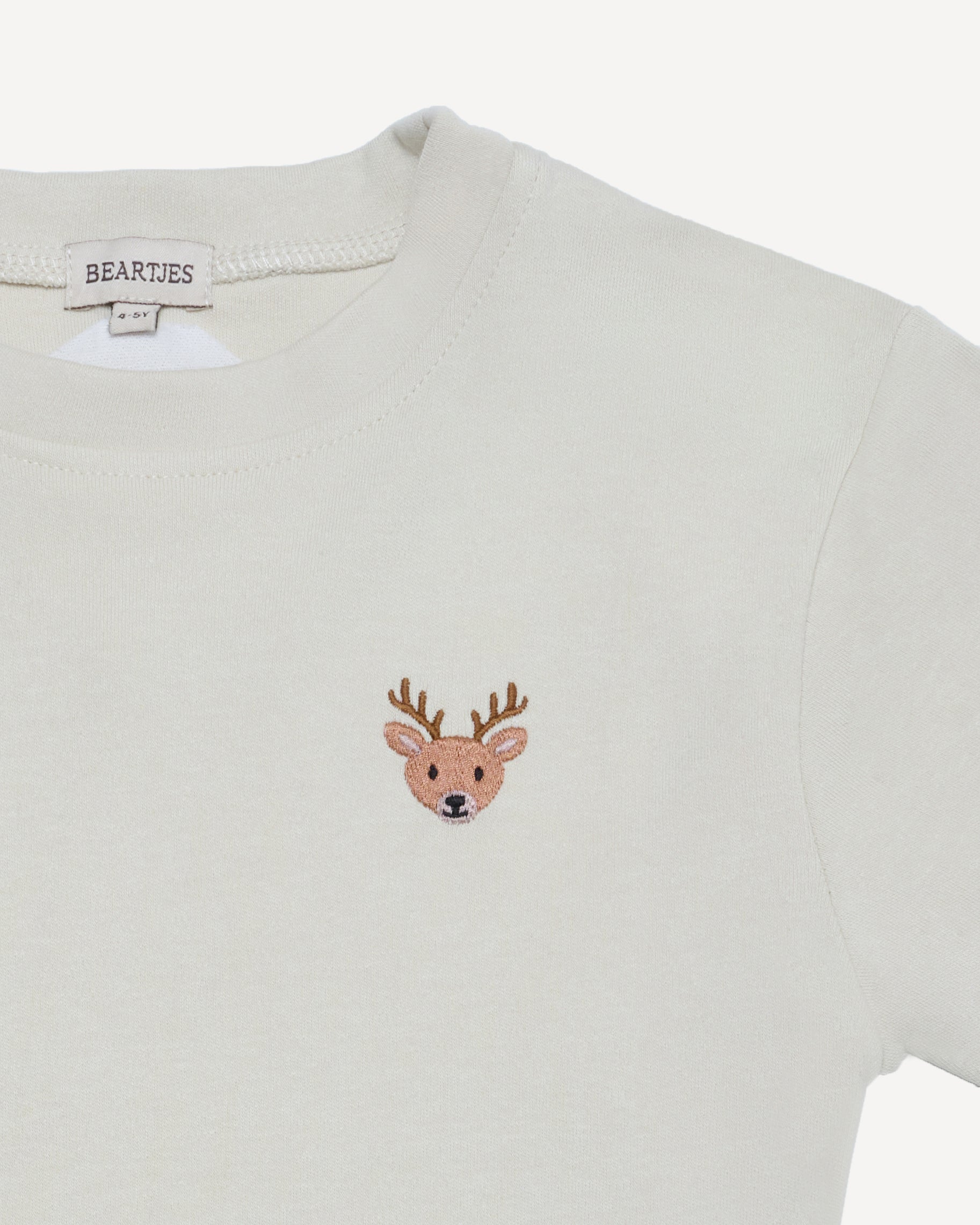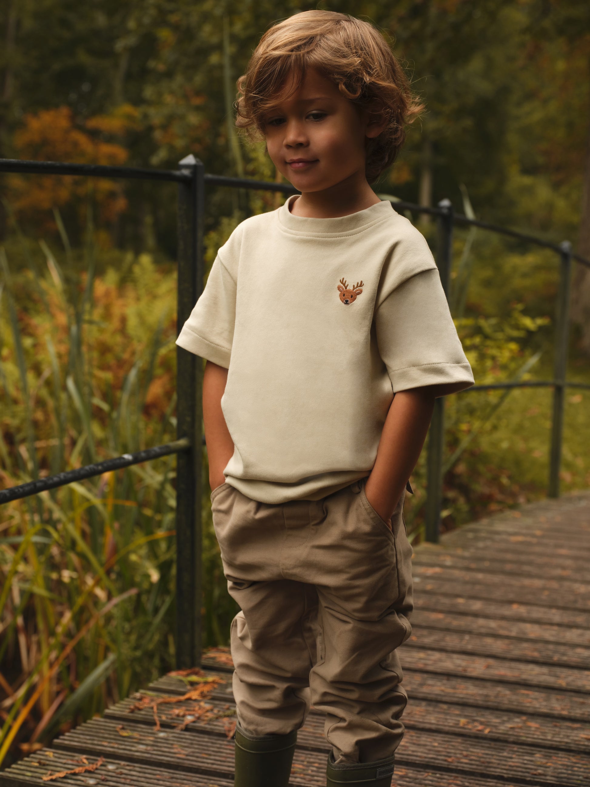 Dagelijks comfort met een speelse twist. Gemaakt van zachte stof en afgewerkt met een geborduurd hertje, is dit het perfecte T-shirt voor kleine ontdekkers. Eenvoudig te dragen, de hele dag door.